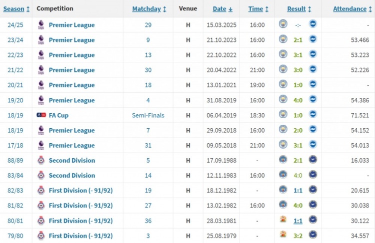 據(jù)德轉(zhuǎn)數(shù)據(jù)統(tǒng)計(jì),歷史上曼城曾在各項(xiàng)賽事14次主場對陣布萊頓,取得12勝2平的戰(zhàn)績,共計(jì)打進(jìn)34球,丟8球。