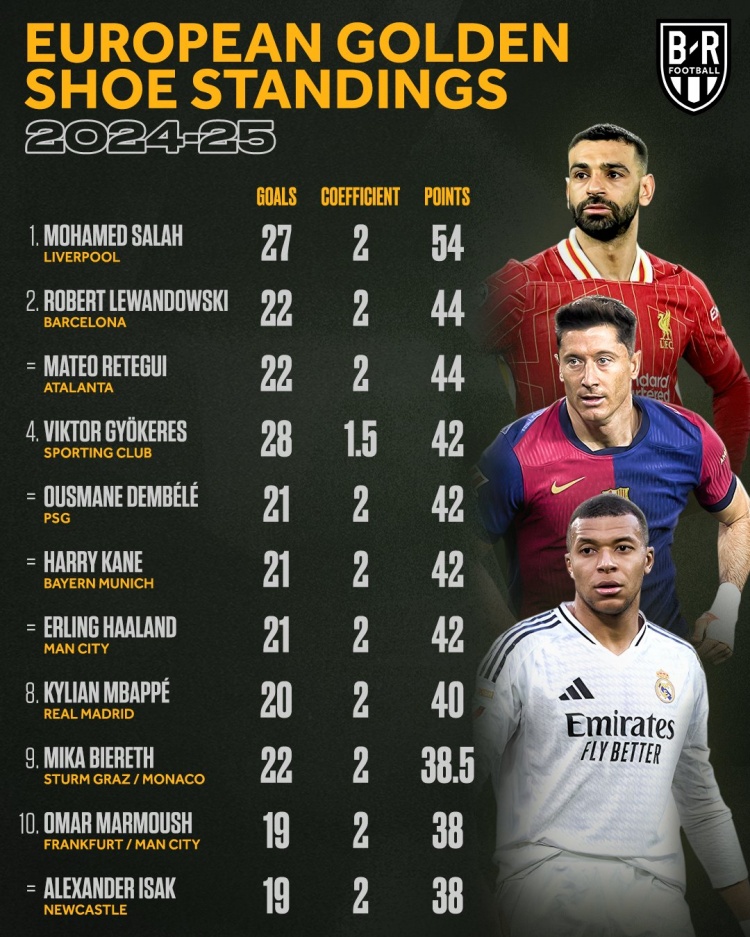 3月18日訊 B/R Fooball統(tǒng)計了本賽季球員的聯(lián)賽進(jìn)球數(shù)量,并列出歐洲金靴排名,薩拉赫54分領(lǐng)跑,萊萬、雷特吉44分次席。