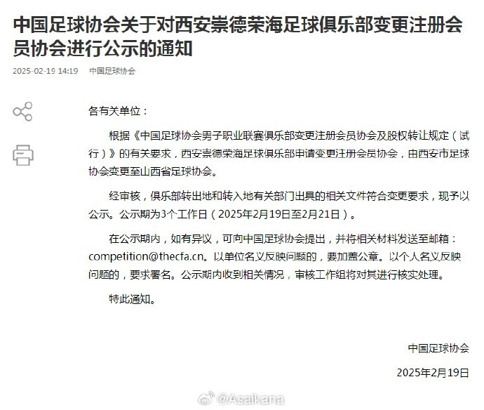中國(guó)足協(xié)公示西安崇德榮海足球俱樂(lè)部從西安市足協(xié)變更注冊(cè)地到山西省足協(xié)。俱樂(lè)部公眾號(hào)發(fā)出的文章稱球隊(duì)將改名為山西省足球俱樂(lè)部。繼上賽季2家俱樂(lè)部后,這是《中國(guó)足球協(xié)會(huì)男子職業(yè)聯(lián)賽俱樂(lè)部變更注冊(cè)會(huì)員協(xié)會(huì)及股權(quán)轉(zhuǎn)讓規(guī)定(試行)》施行來(lái)第8家進(jìn)行異地轉(zhuǎn)移的男足職業(yè)俱樂(lè)部: